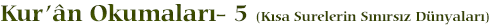 Ama bir de, ekmek gibi, su gibi, hatta hava gibi her gün ve her an muhtaç olduğumuz manevî gıda ve şifaları bize taşıyan; hâfızaya alınması ve hatırlanması nisbeten kolay Kur’ânî gıdalar vardır: kısa sûreler yani. Bakara gibi iki cüzü aşan, Nisâ gibi iki cüze yaklaşan, Şuarâ ve Sâffât gibi ikiyüz civarında âyet içeren sûreler yanında, bazıları bir satıra sığabilen, birkaç âyetten ibaret kısa sûreler...
